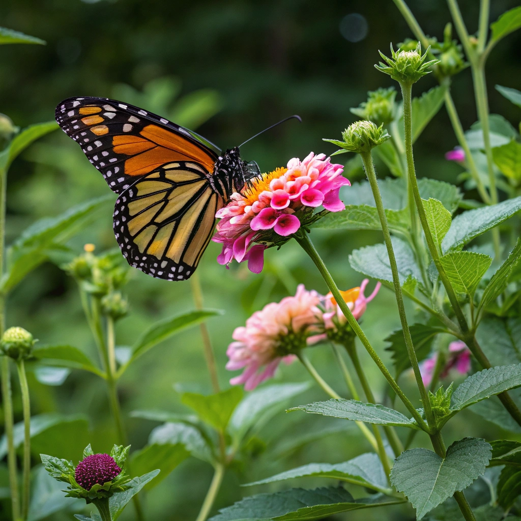 - A close-up of a colorful butterfly perched on a blooming flower, surrounded by lush greenery.