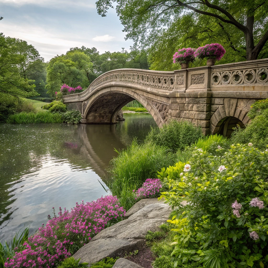 A beautiful stone bridge arching over a quiet river, surrounded by lush greenery and blooming flowers.