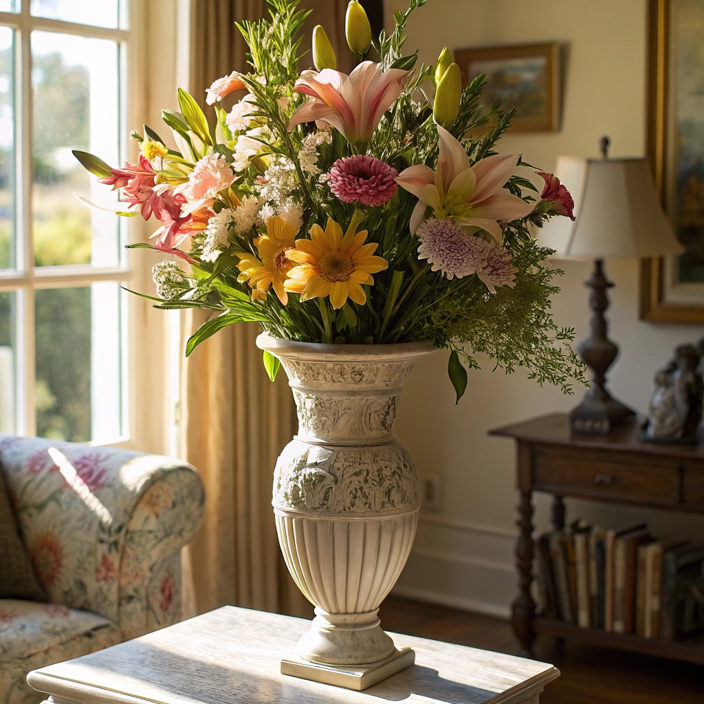 A beautifully crafted vase filled with fresh flowers in a sunlit room.