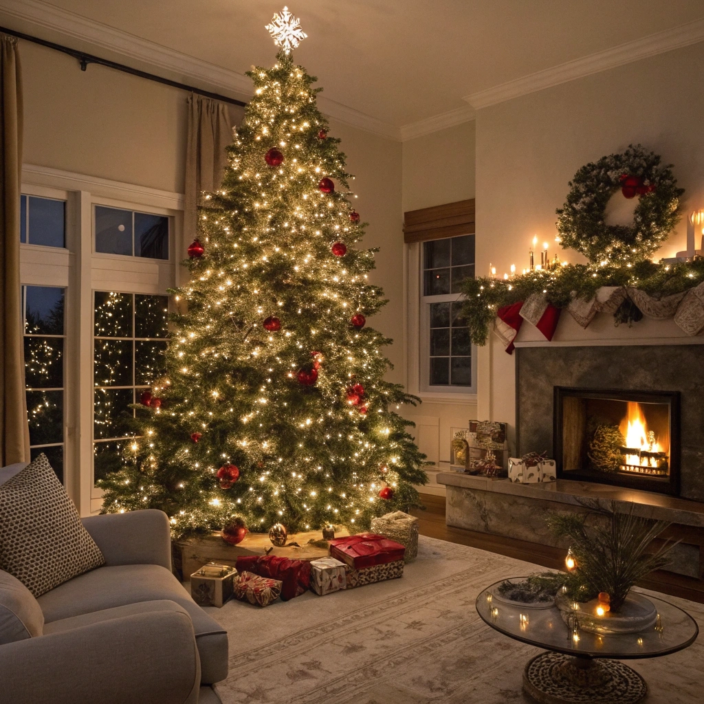 A beautifully decorated Christmas tree in a cozy living room with soft lights and festive ornaments