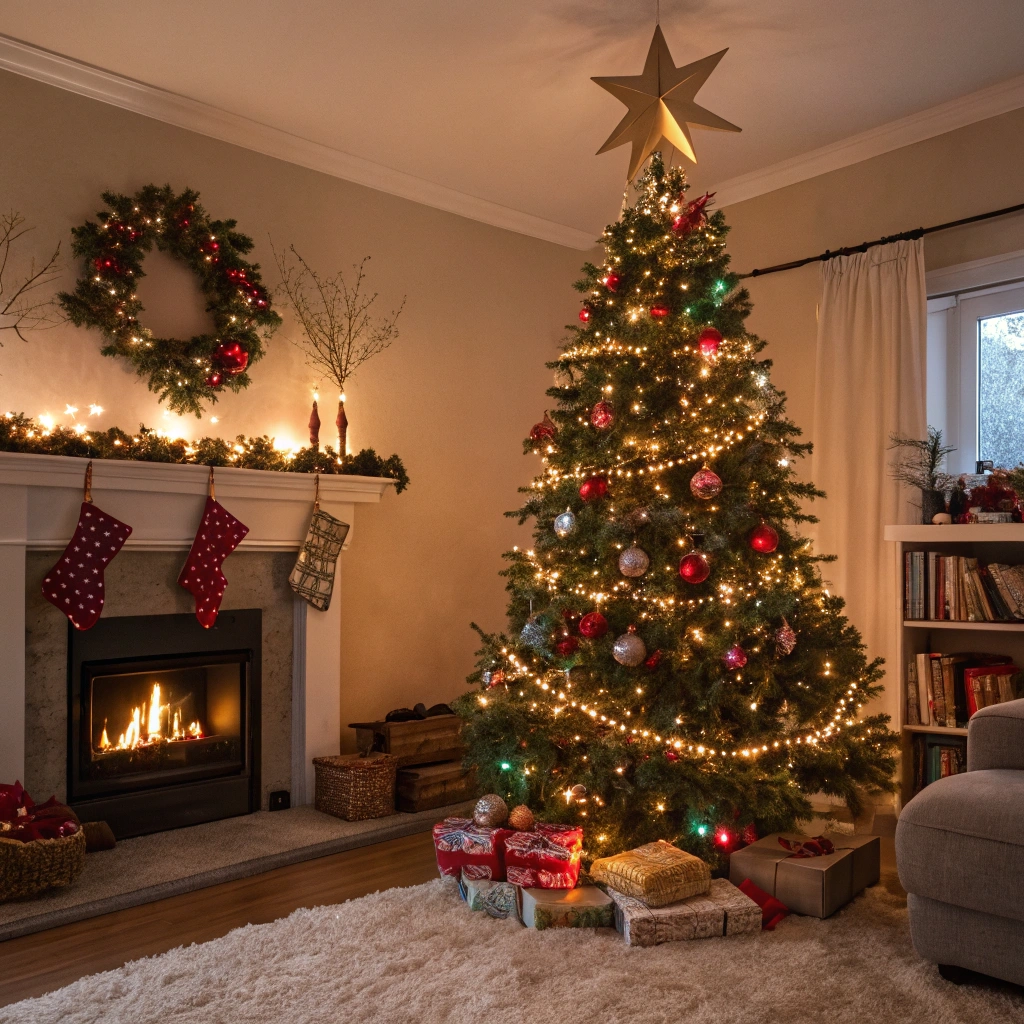 A beautifully decorated Christmas tree with twinkling lights set against a cozy living room backdrop.