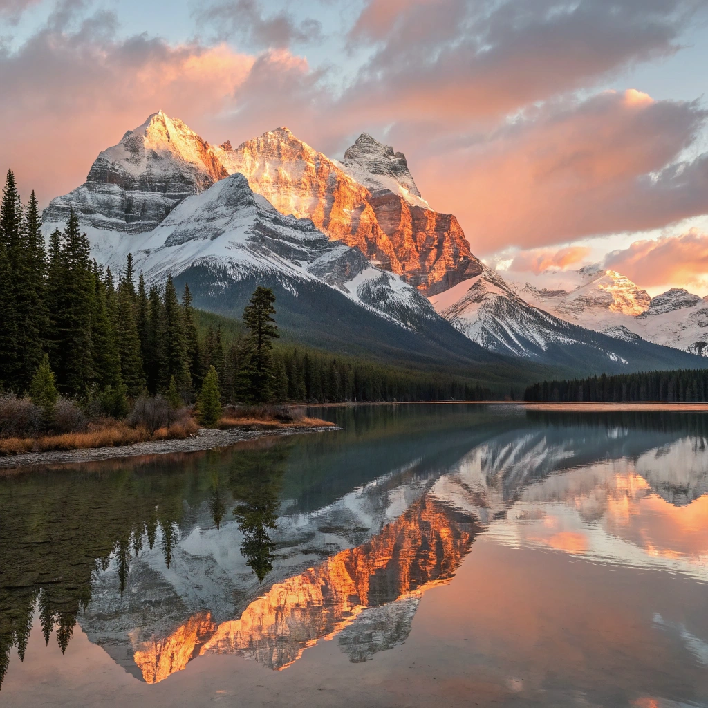 A breathtaking mountain range reflecting in a serene lake during sunrise.