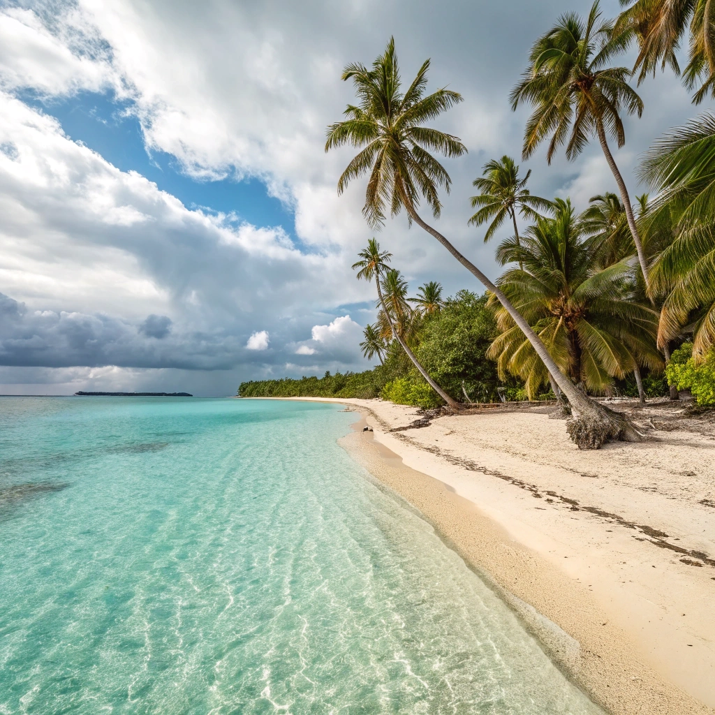 A breathtaking view of a tropical beach with crystal-clear water and palm trees.