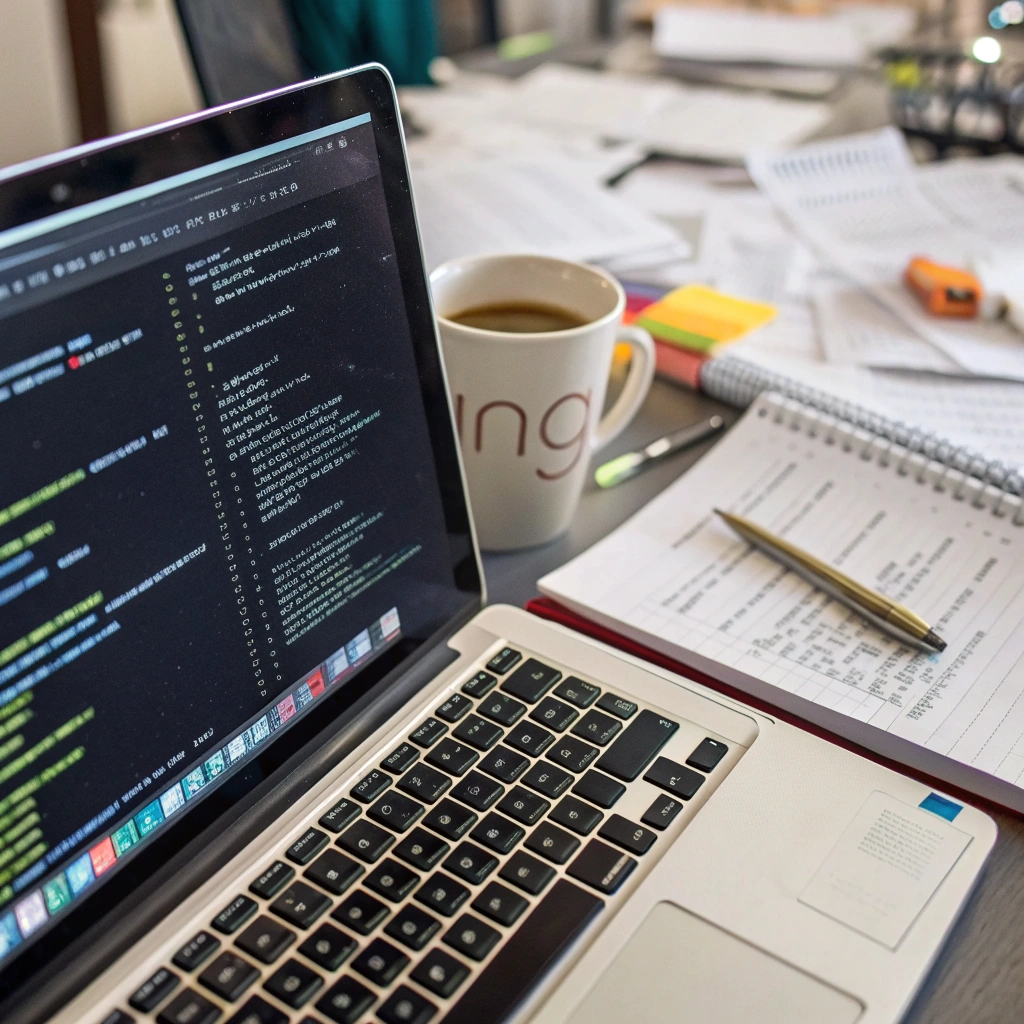 A close-up of a laptop with coding on the screen amidst office clutter.