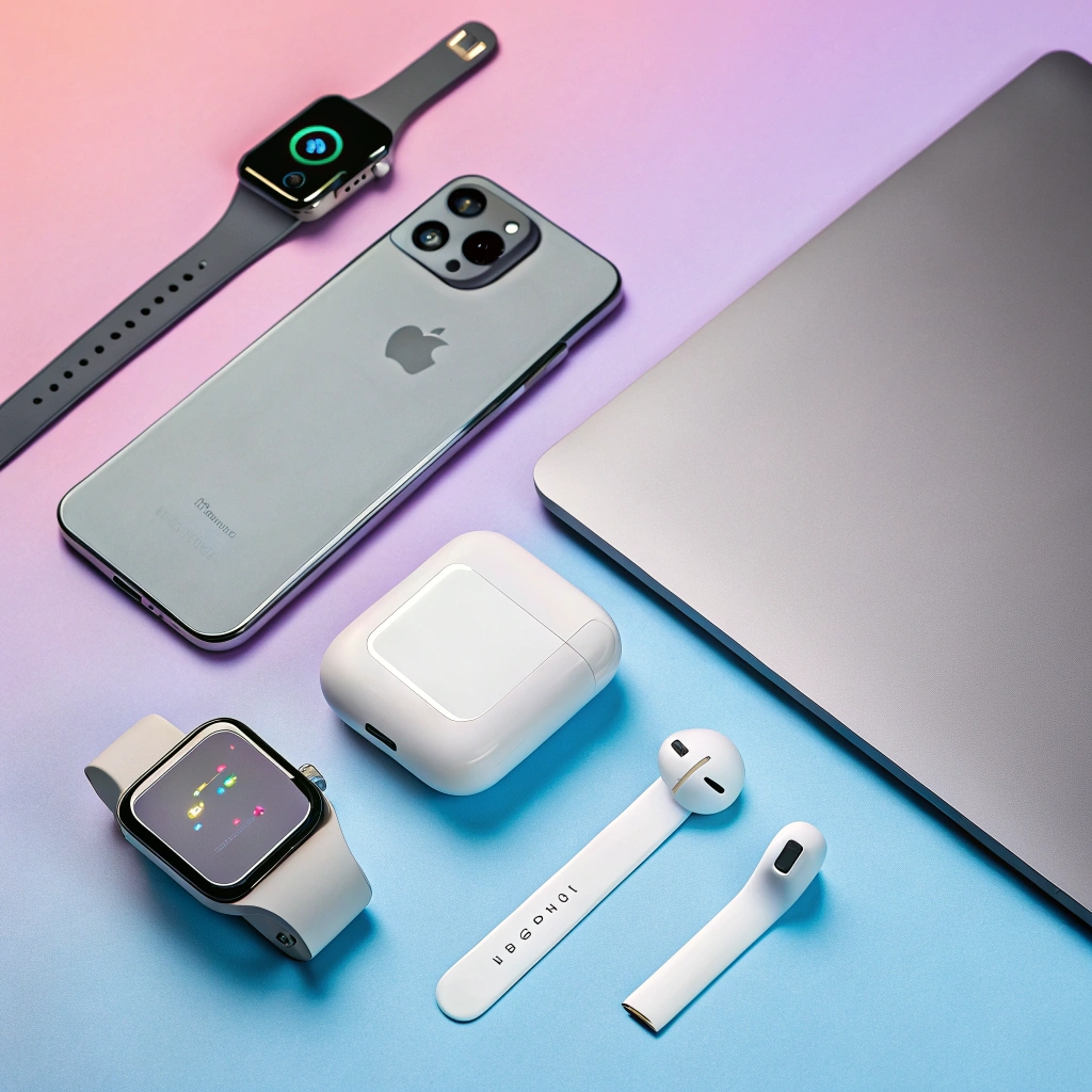 A collection of high-tech gadgets arranged aesthetically on a bright background, emphasizing modern innovation.
