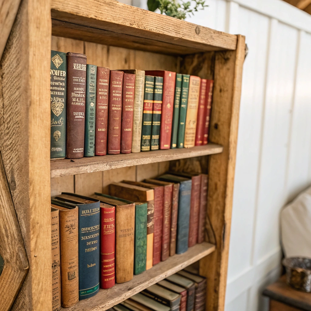 A collection of vintage books arranged creatively on a rustic wooden shelf