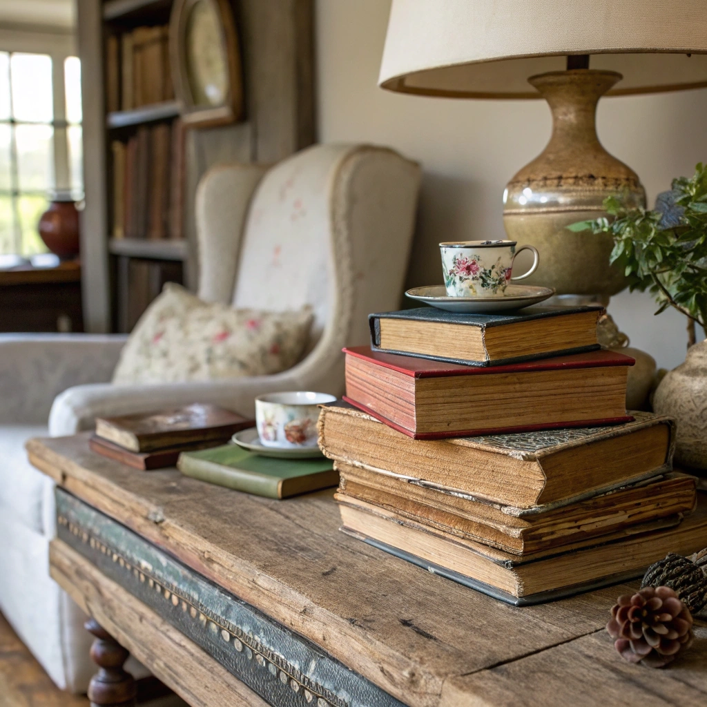 A collection of vintage books stacked on a rustic shelf in a cozy nook.