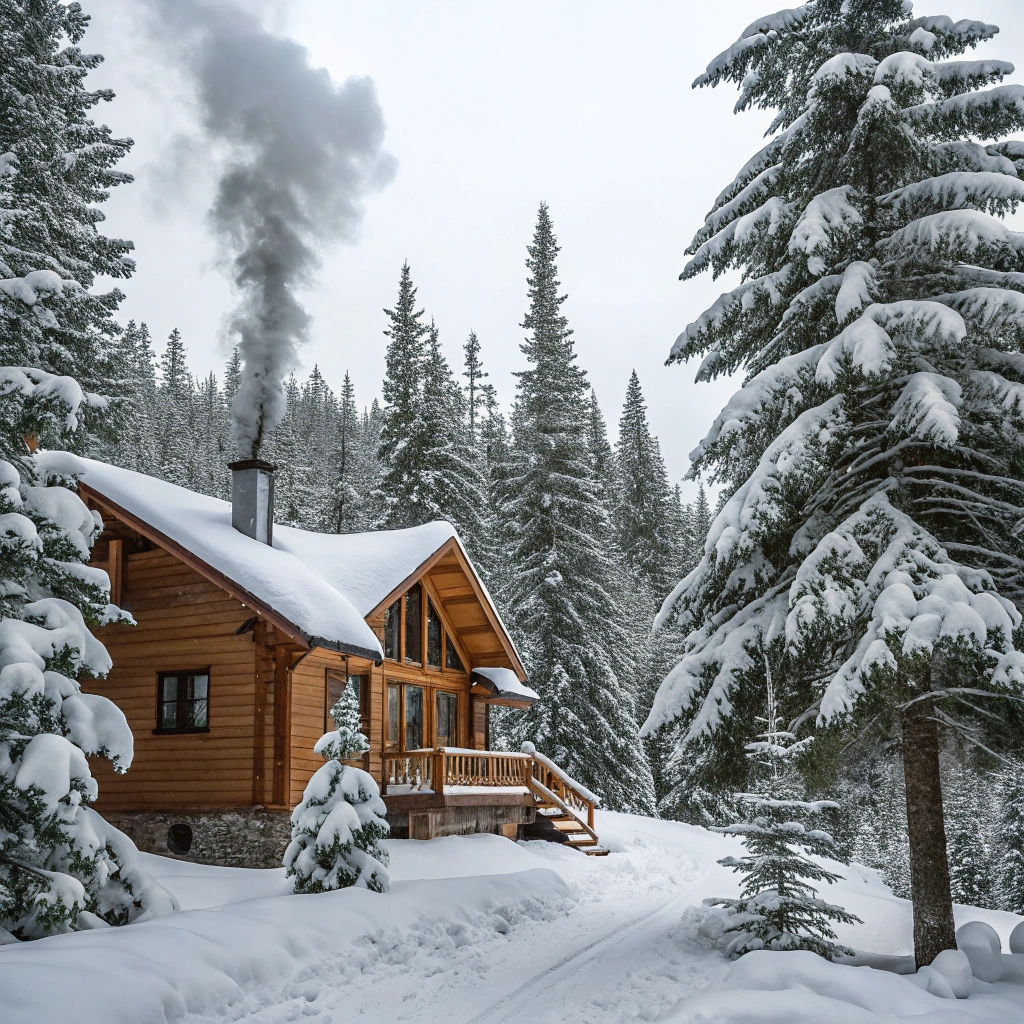 A cozy cabin surrounded by snow-covered pine trees during winter.