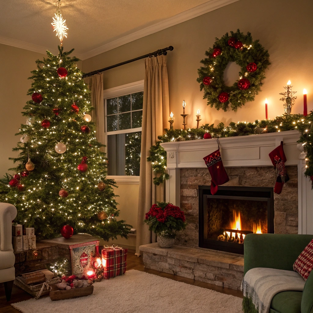 A cozy, decorated living room with a festive fireplace for the holiday season.