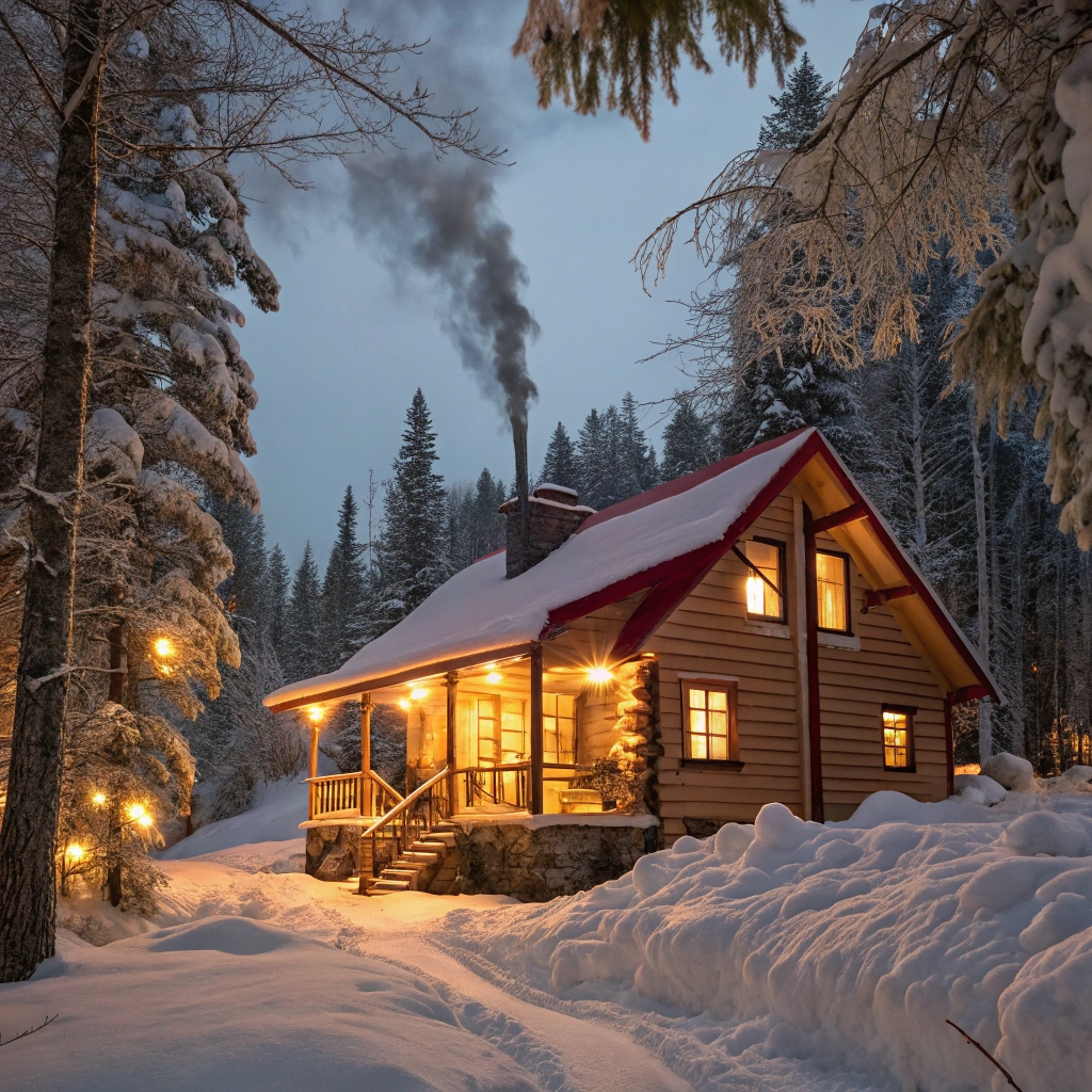 A cozy winter cabin surrounded by snow-covered trees, illuminated by warm lights.