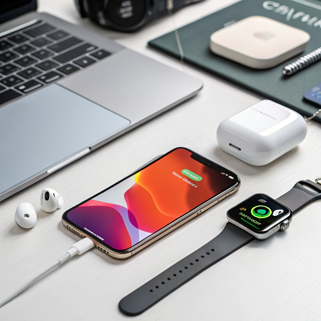 A cutting-edge smartphone resting on a sleek desk with tech gadgets around