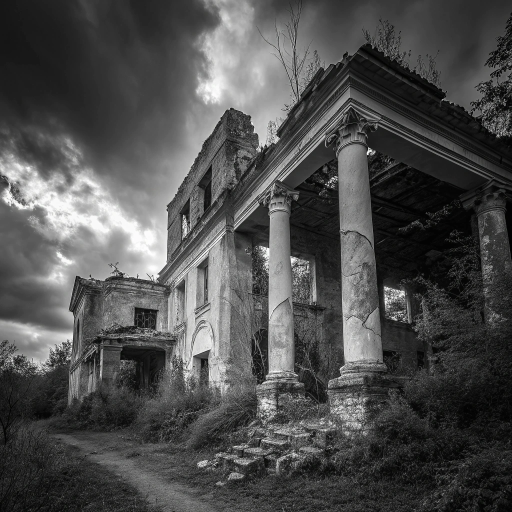 A dramatic black and white photo of crumbling architecture, telling a story of history and decay