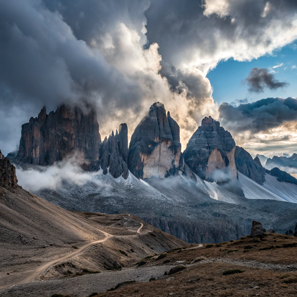 A dramatic mountain landscape with jagged peaks piercing the clouds.