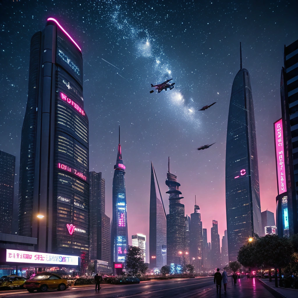 A futuristic city skyline at night, illuminated by neon lights and flying vehicles.