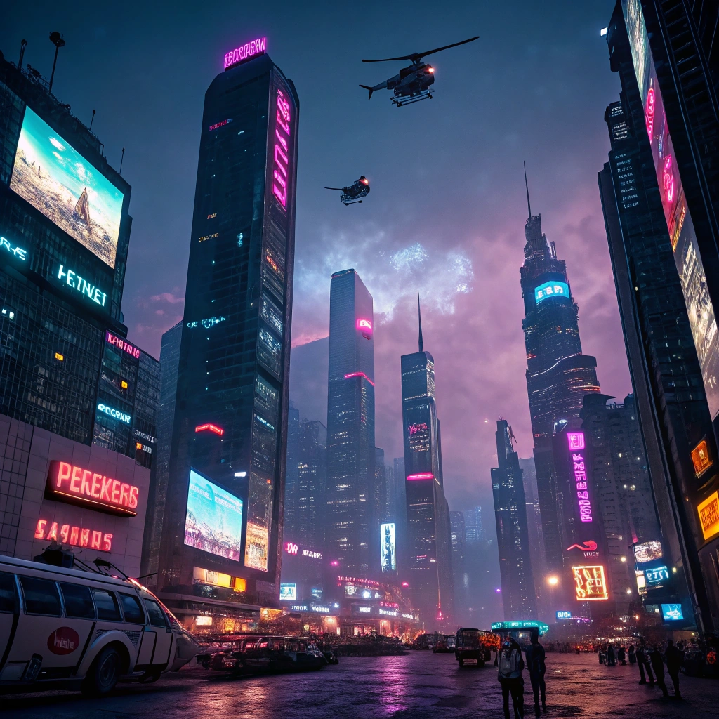 A futuristic cityscape at night, illuminated by neon lights and flying vehicles