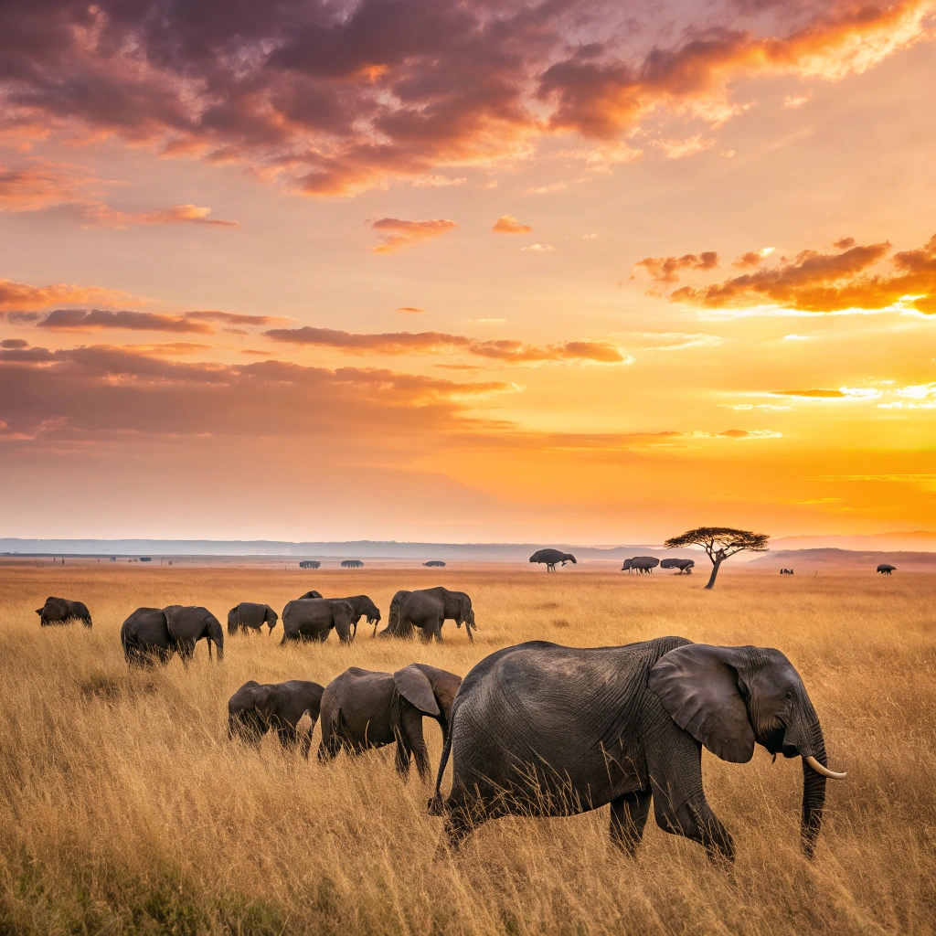 A herd of majestic elephants roaming freely across the savanna under a golden sunset.