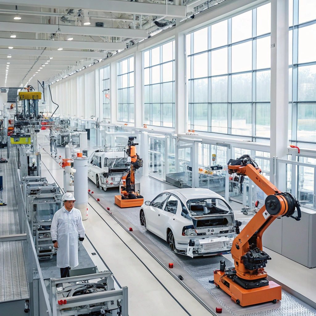A high-tech factory showcasing advanced robotic assembly lines in action.
