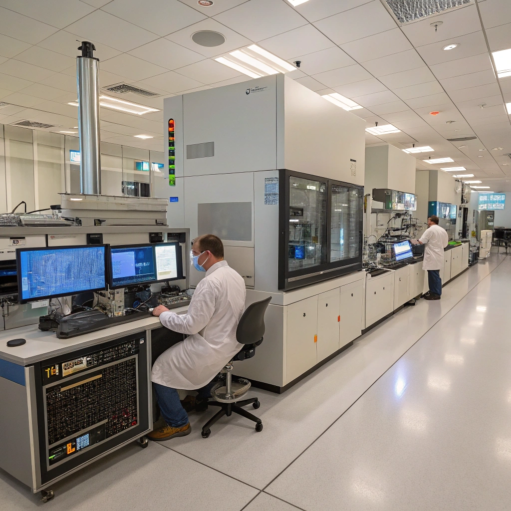 A high-tech laboratory with advanced equipment and glowing screens, emphasizing innovation and research.