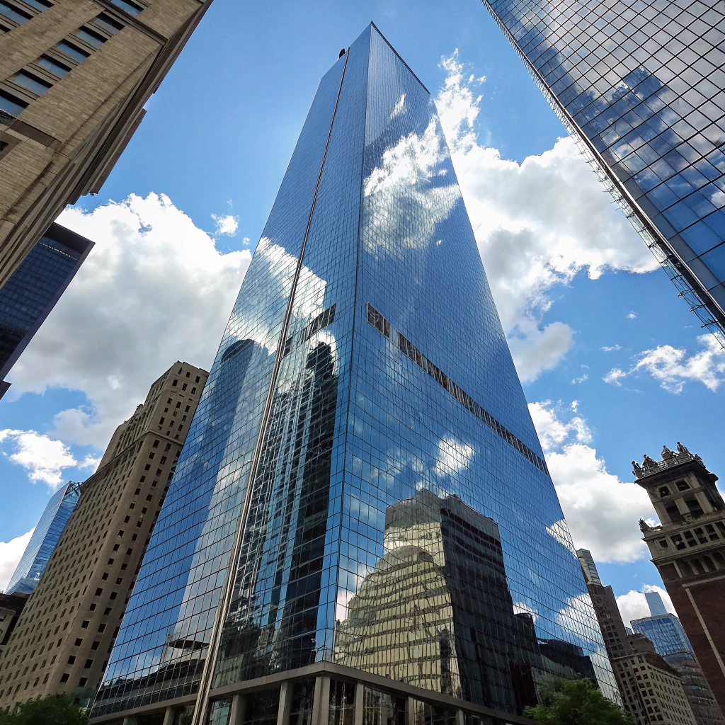 A magnificent glass skyscraper reflecting the cityscape in its surface under a blue sky.