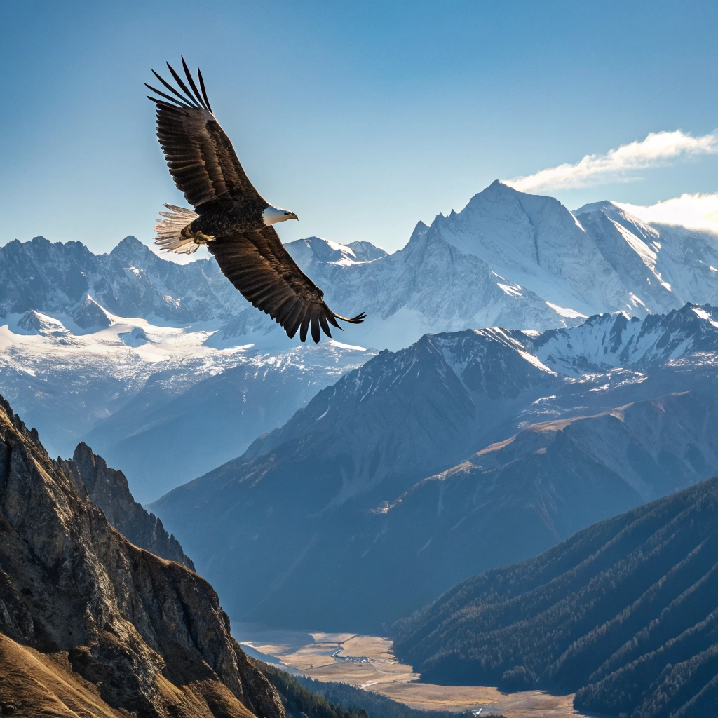 A majestic eagle soaring high above a mountainous landscape under a bright blue sky.