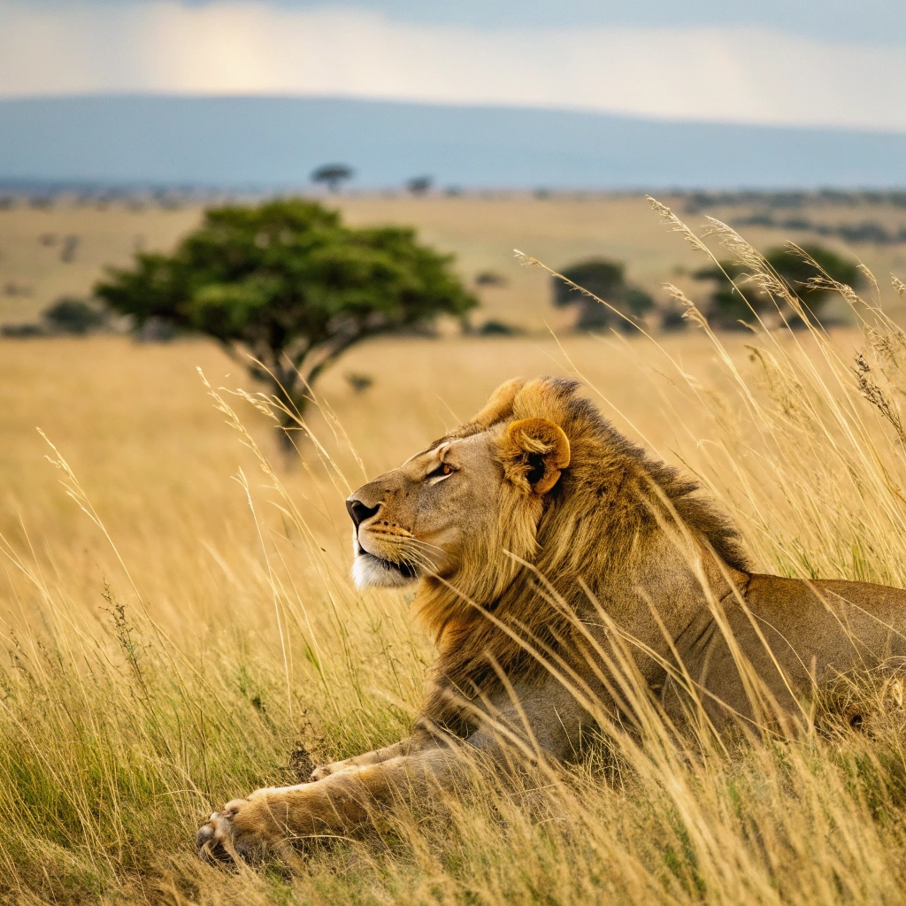 A majestic lion lounging on the savannah, with golden grasses swaying in the breeze.