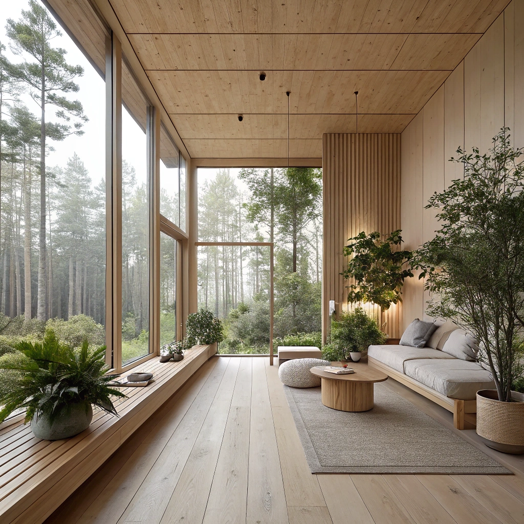 A minimalist home design featuring light wood tones, natural elements, and large windows for nature immersion