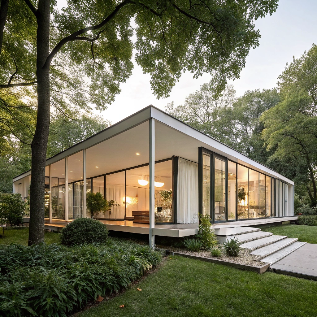 A minimalist house with an innovative design, surrounded by lush greenery and natural light.