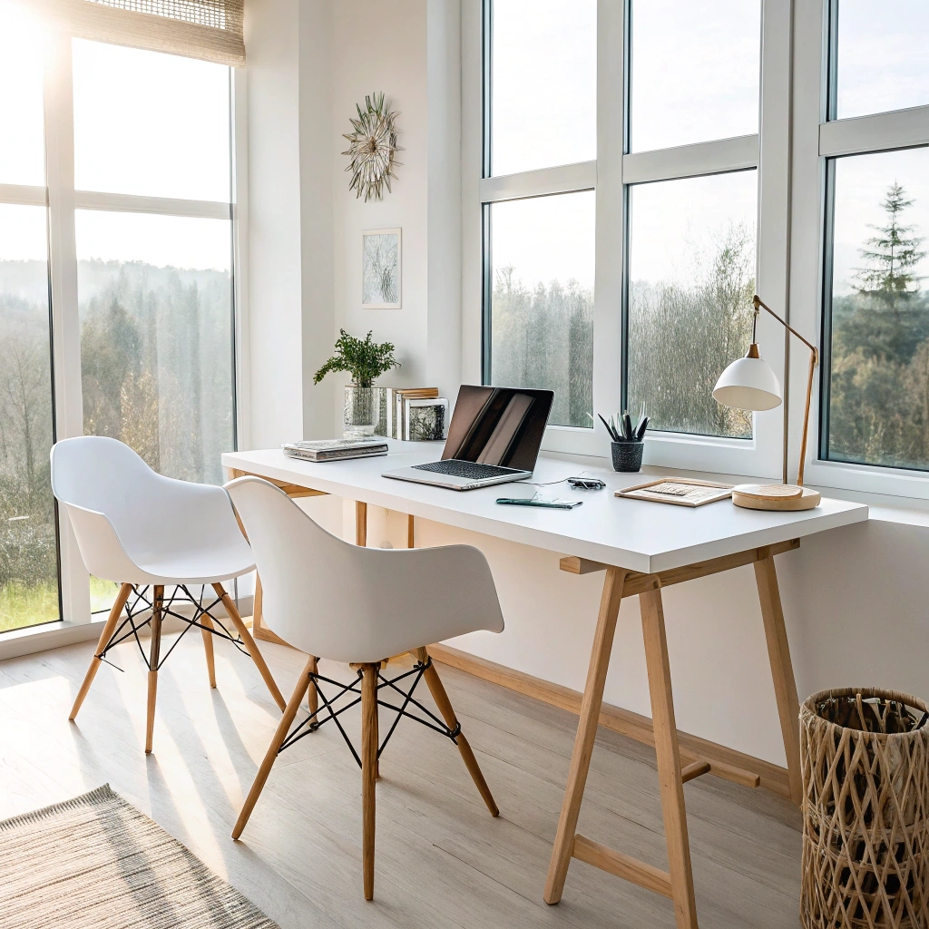 A minimalist workspace with innovative technology and sleek furniture, bathed in natural light.