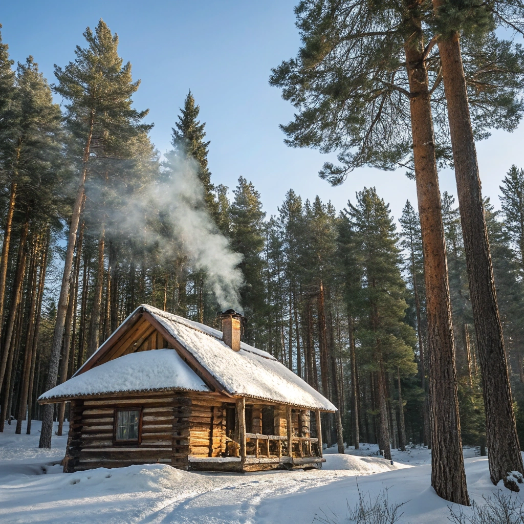 A rustic wooden cabin nestled in a snowy forest surrounded by towering pine trees.