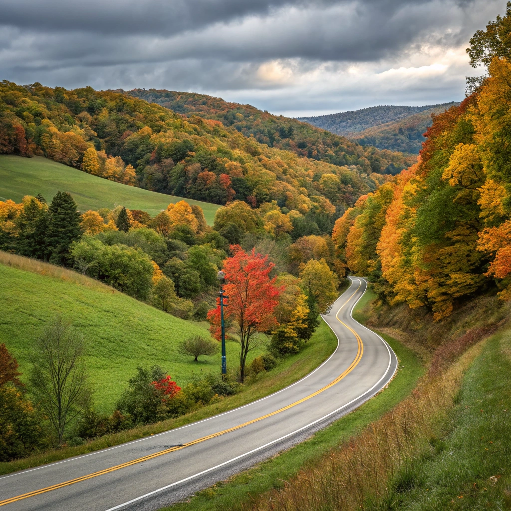 A scenic road winding through lush green hills in autumn.