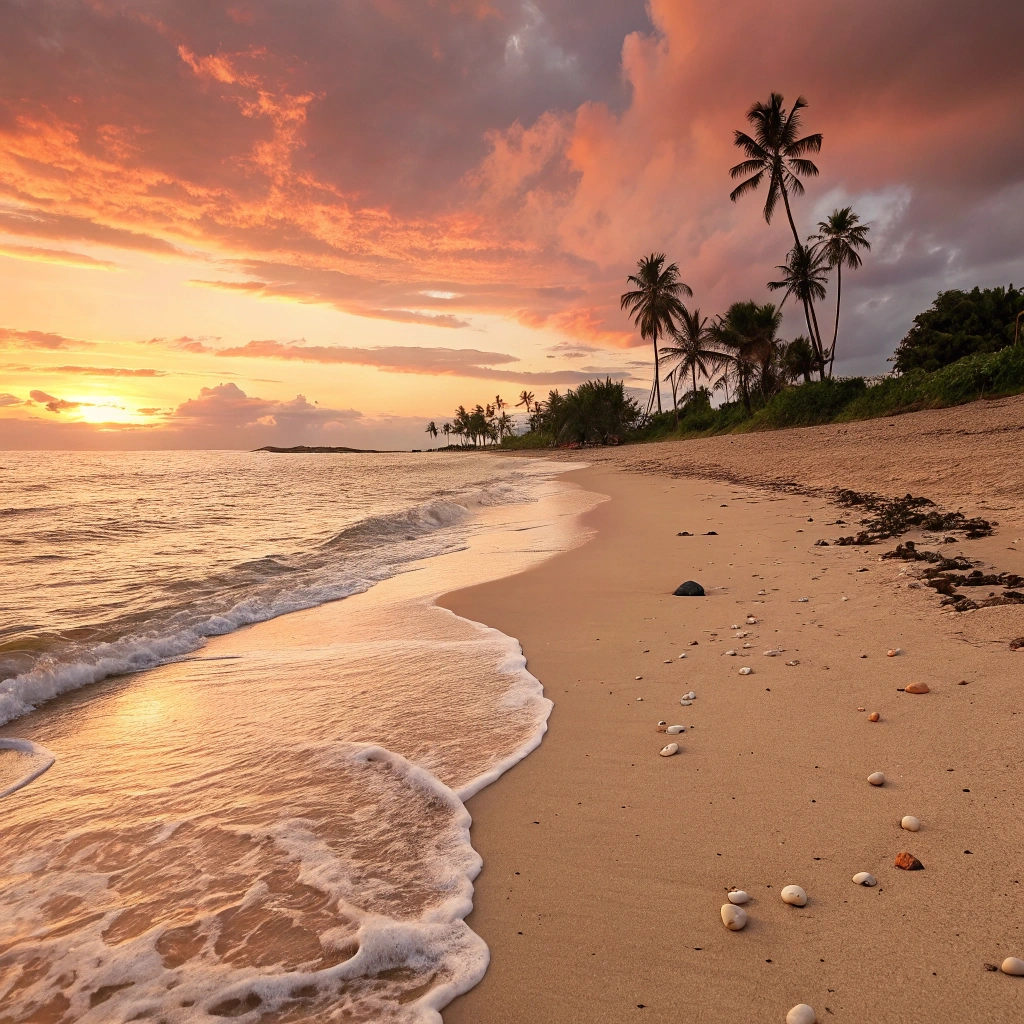 A serene beach with soft waves lapping at the shore during a picturesque sunset.