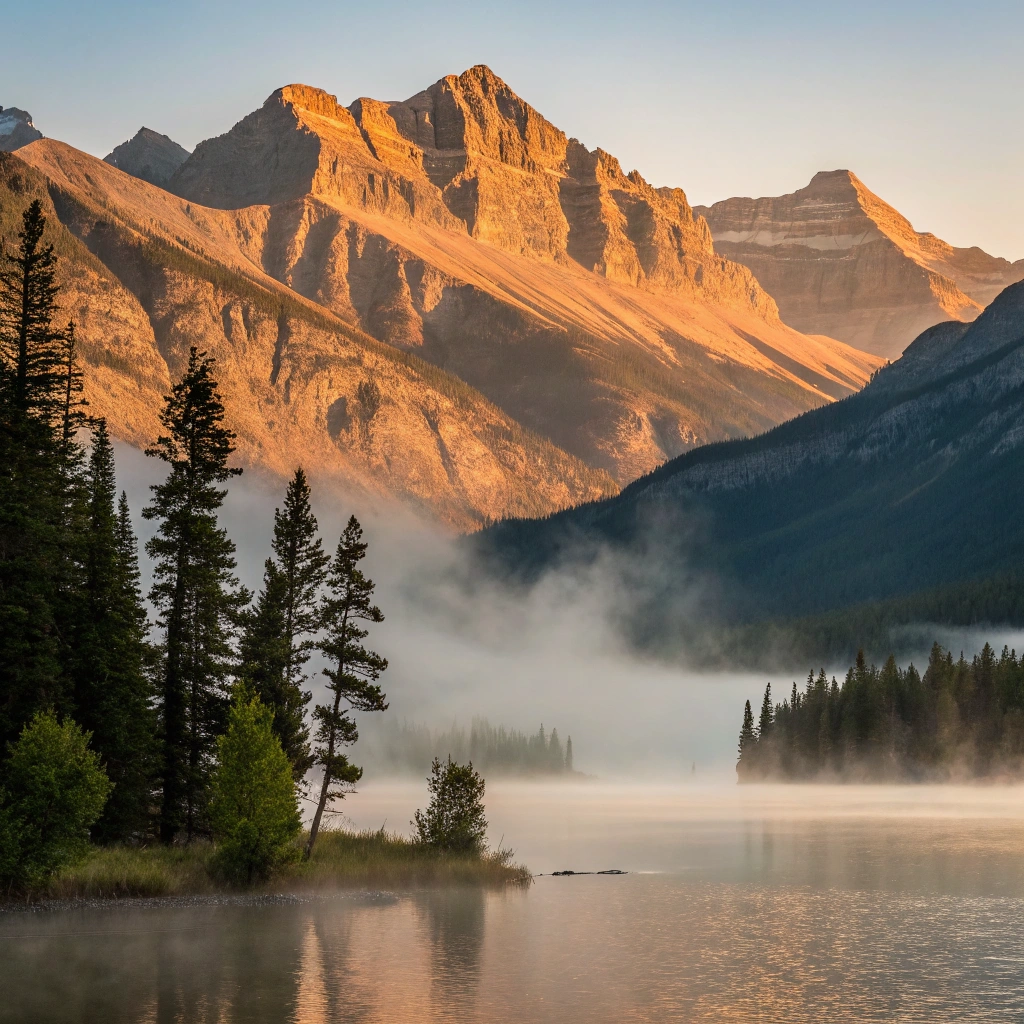 A serene mountain landscape at sunrise, with mist rising from a tranquil lake