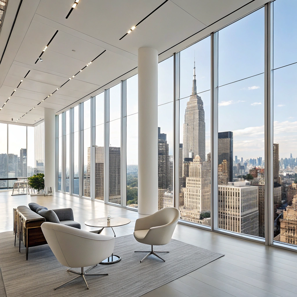 A sleek modern office space with minimalist design elements and large windows showcasing a city view.
