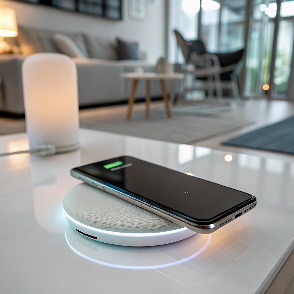 A sleek smartphone resting on a futuristic charging pad, illuminated by ambient light in a modern setting.
