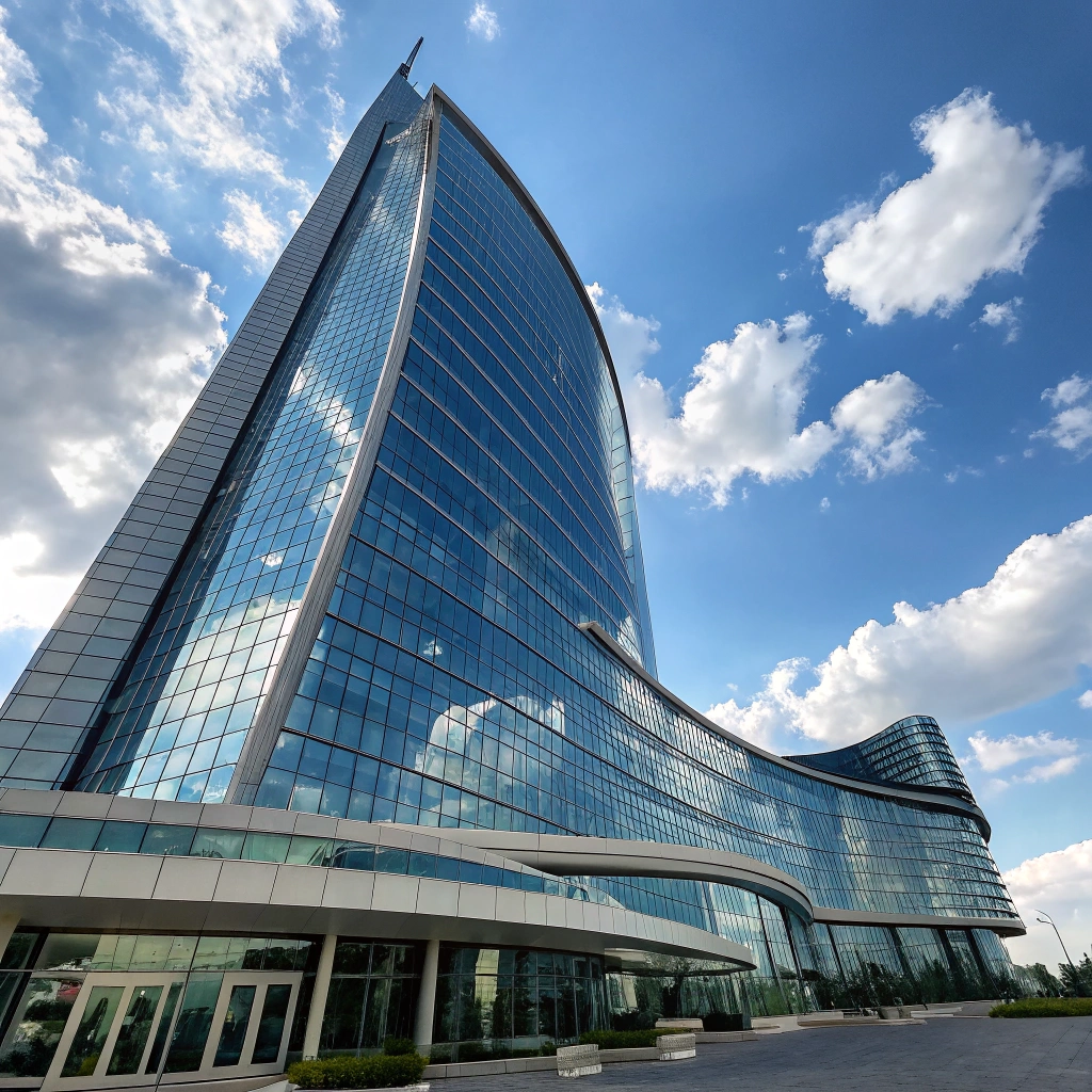 A stunning futuristic building with sweeping curves and reflective glass panels under a blue sky.