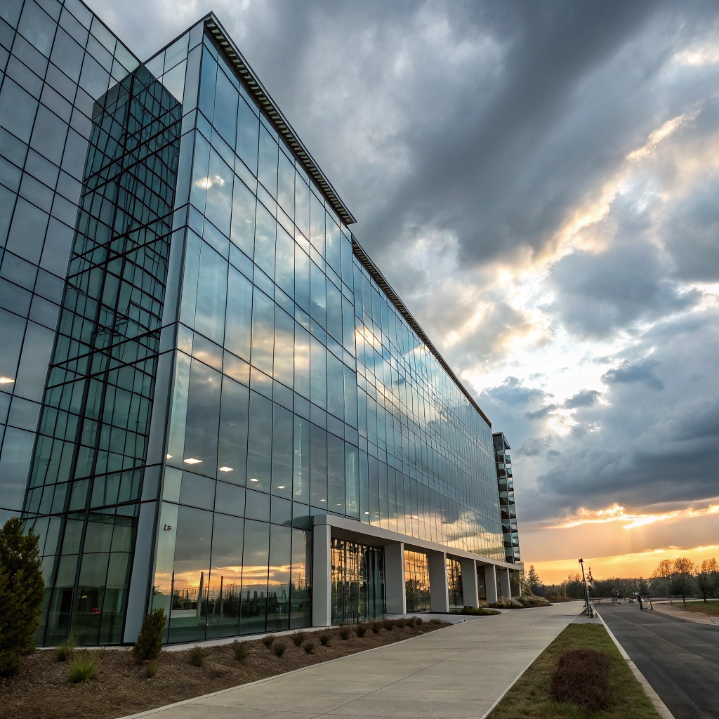 A stunning modern building with glass facades reflecting the sky.