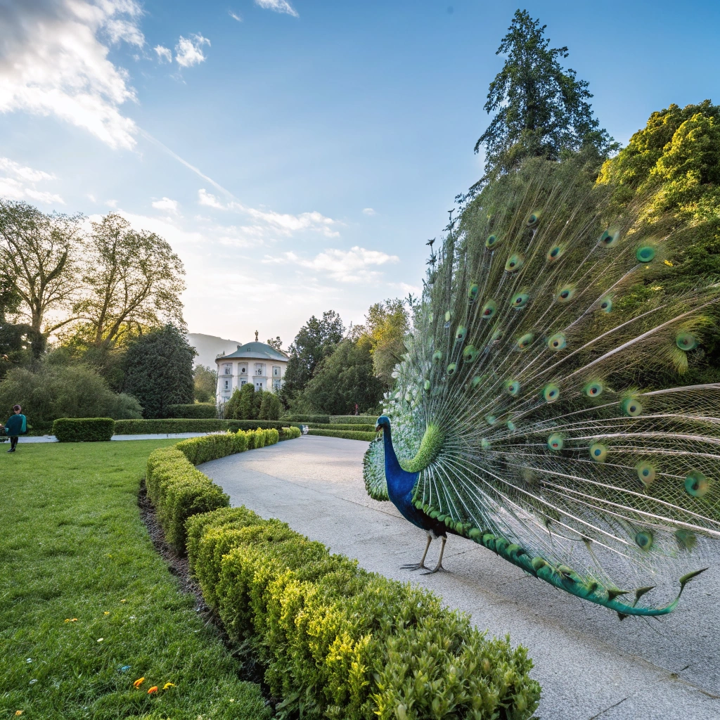 A stunning peacock displaying its colorful feathers in a tranquil park setting.