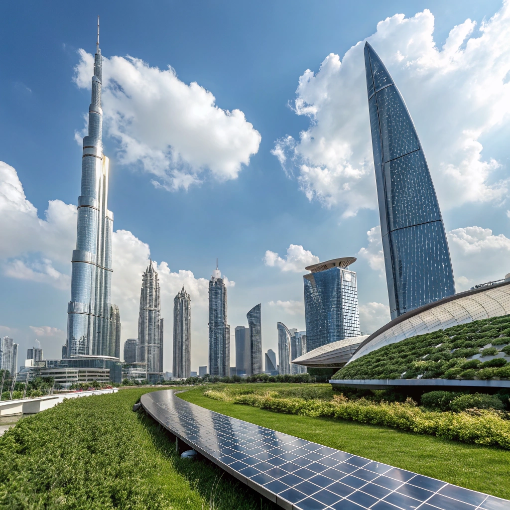 A stunning skyline featuring a blend of futuristic skyscrapers and eco-friendly buildings under a clear blue sky.