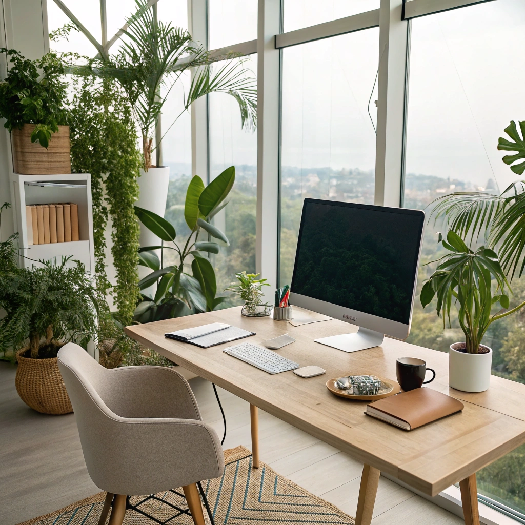 A stylish office workspace with modern furniture, plants, and an inspiring view, promoting productivity