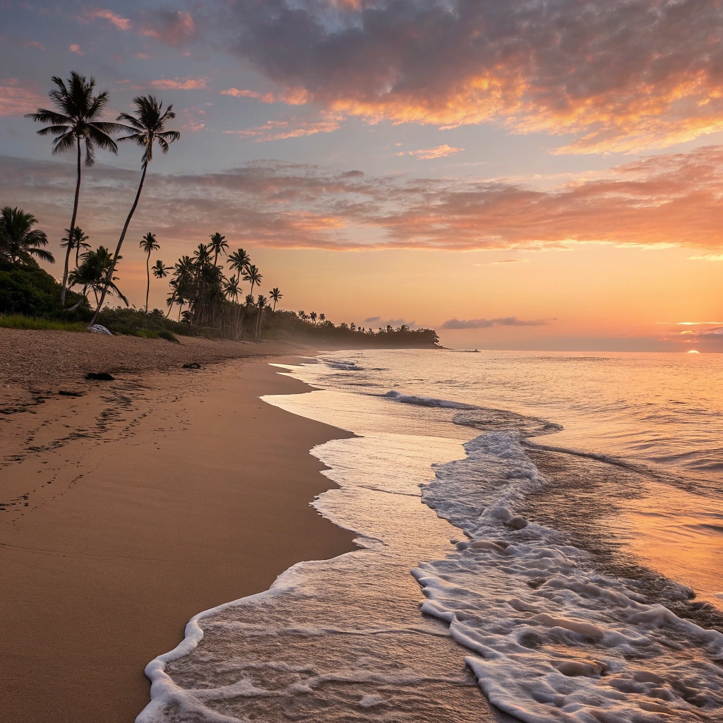 A tranquil beach at sunrise, with soft waves lapping at the shore.