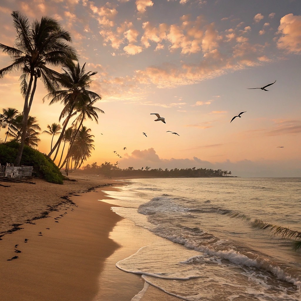 A tranquil beach scene with gentle waves lapping at the shore at sunset.