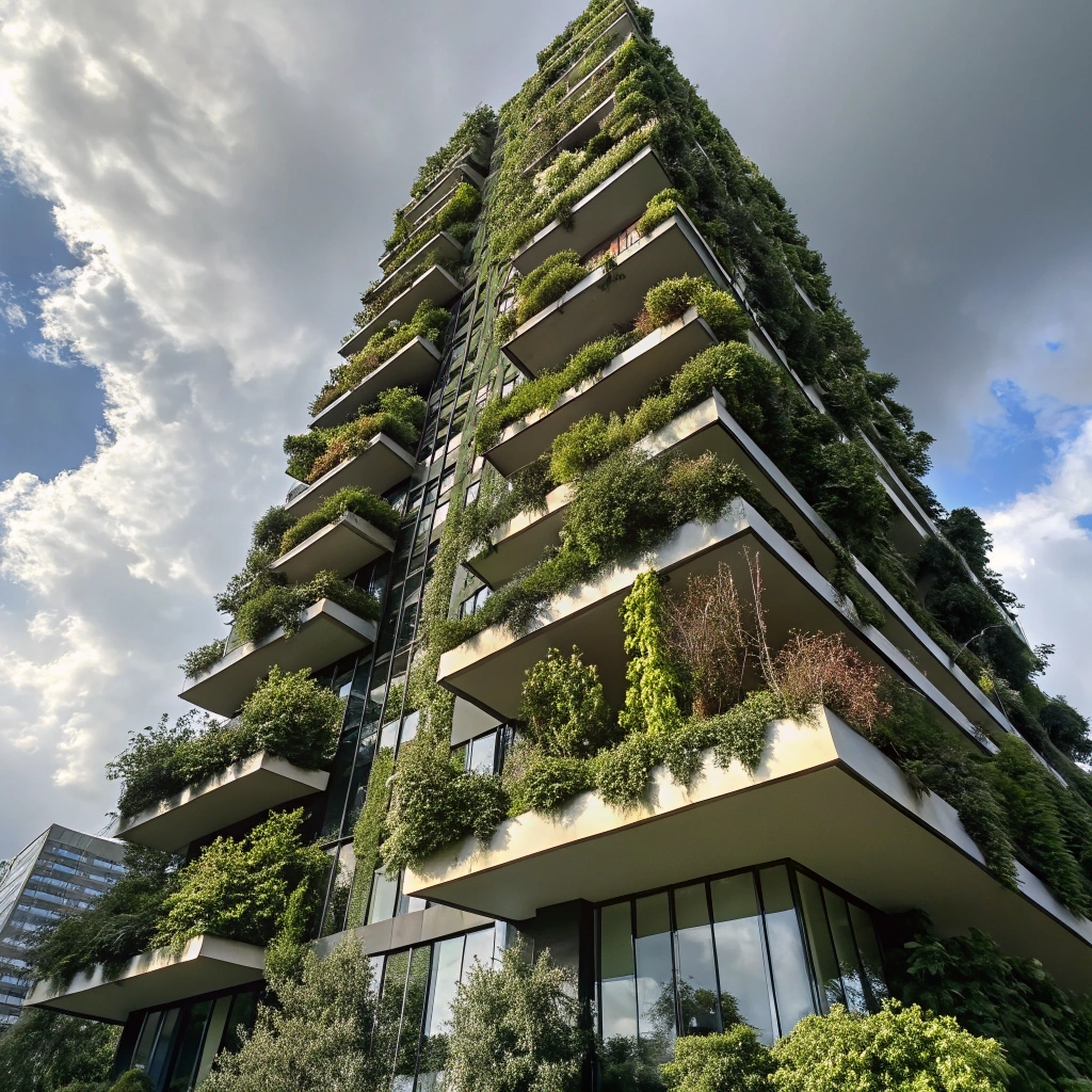 A unique skyscraper with nature-integrated design elements and vertical gardens.