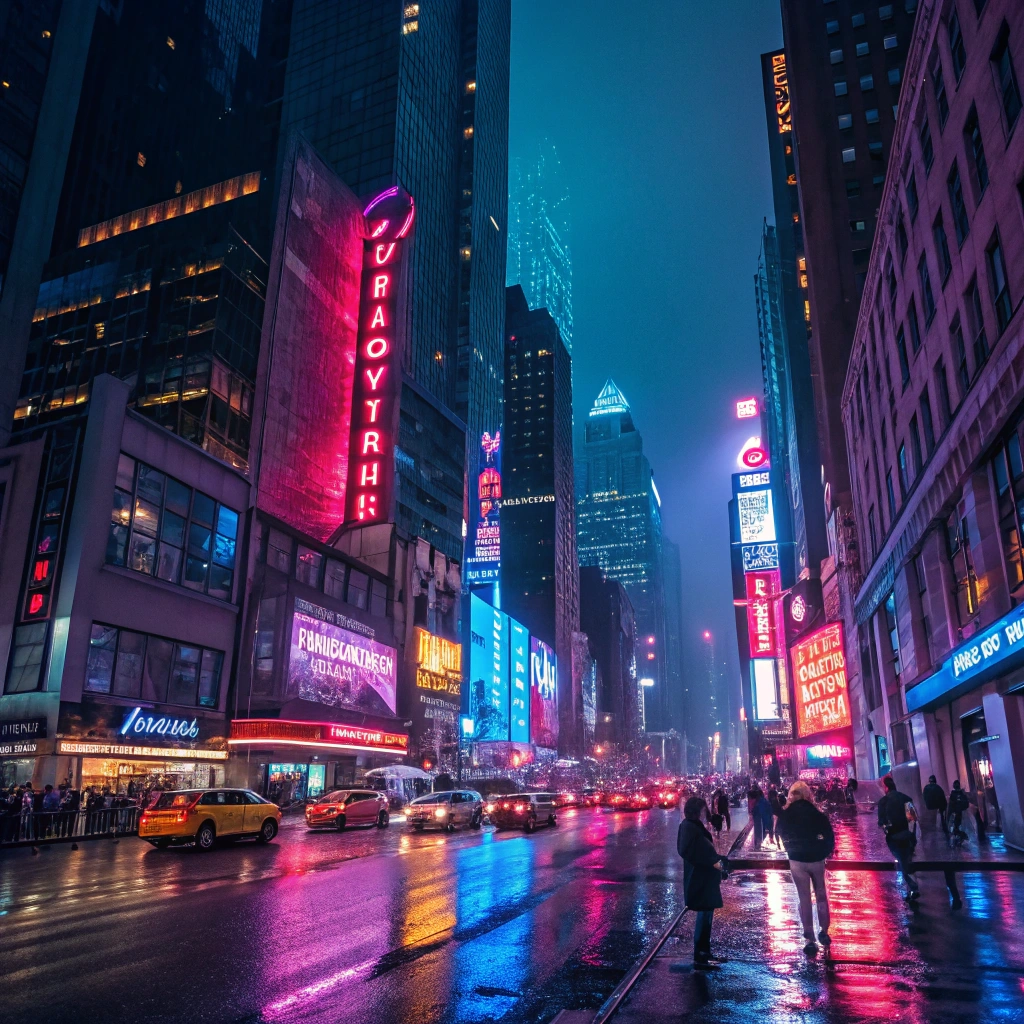 A vibrant cityscape at night, illuminated by colorful neon lights.