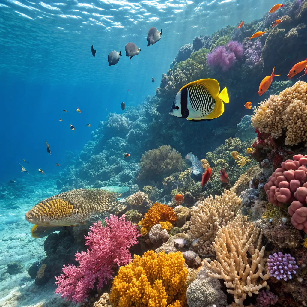 A vibrant coral reef teeming with diverse marine life, showcasing the beauty of underwater ecosystems.