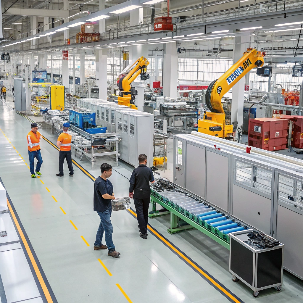 An active factory with workers and machinery, emphasizing productivity and innovation.