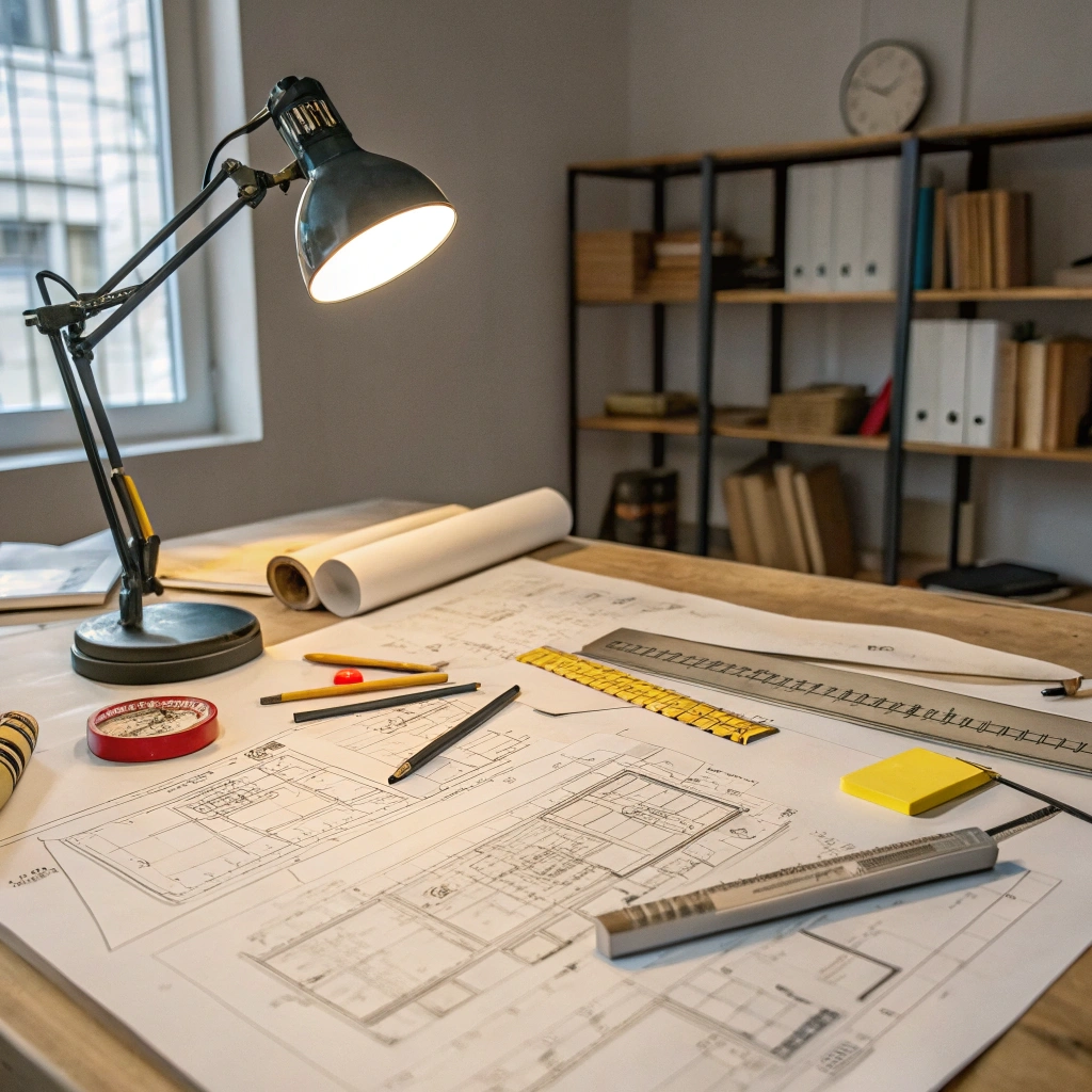 An architect's desk filled with blueprints and design materials under a bright lamp.