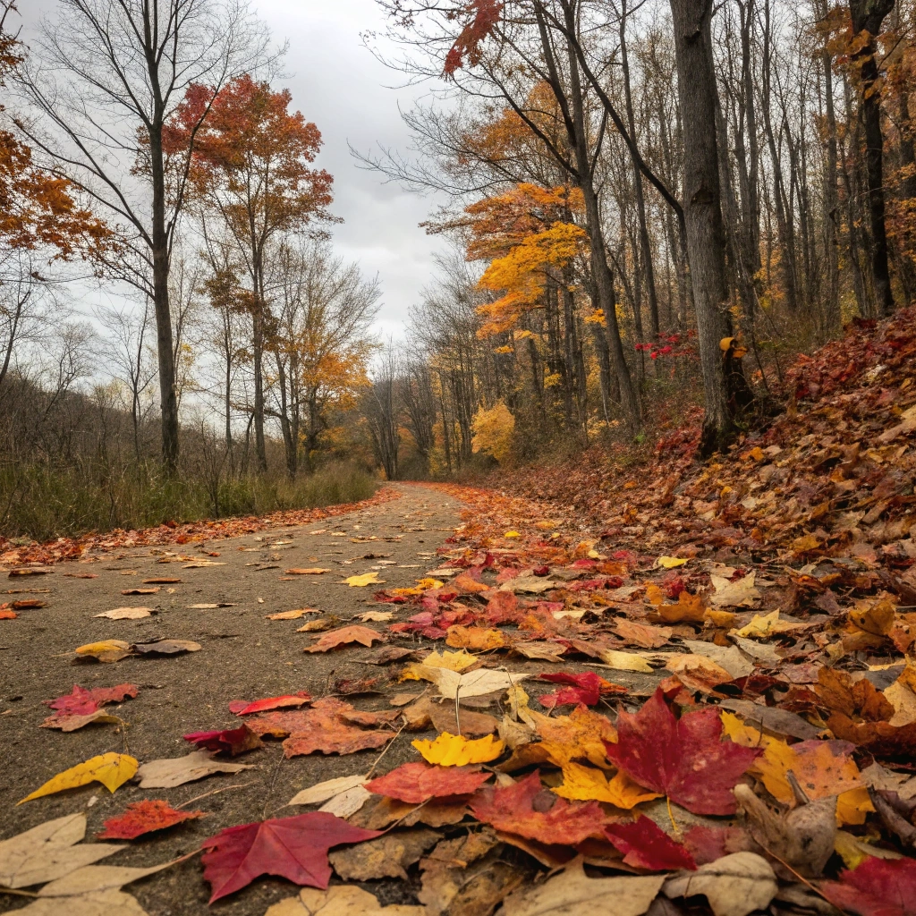An arrangement of colorful leaves scattered on a path during autumn.