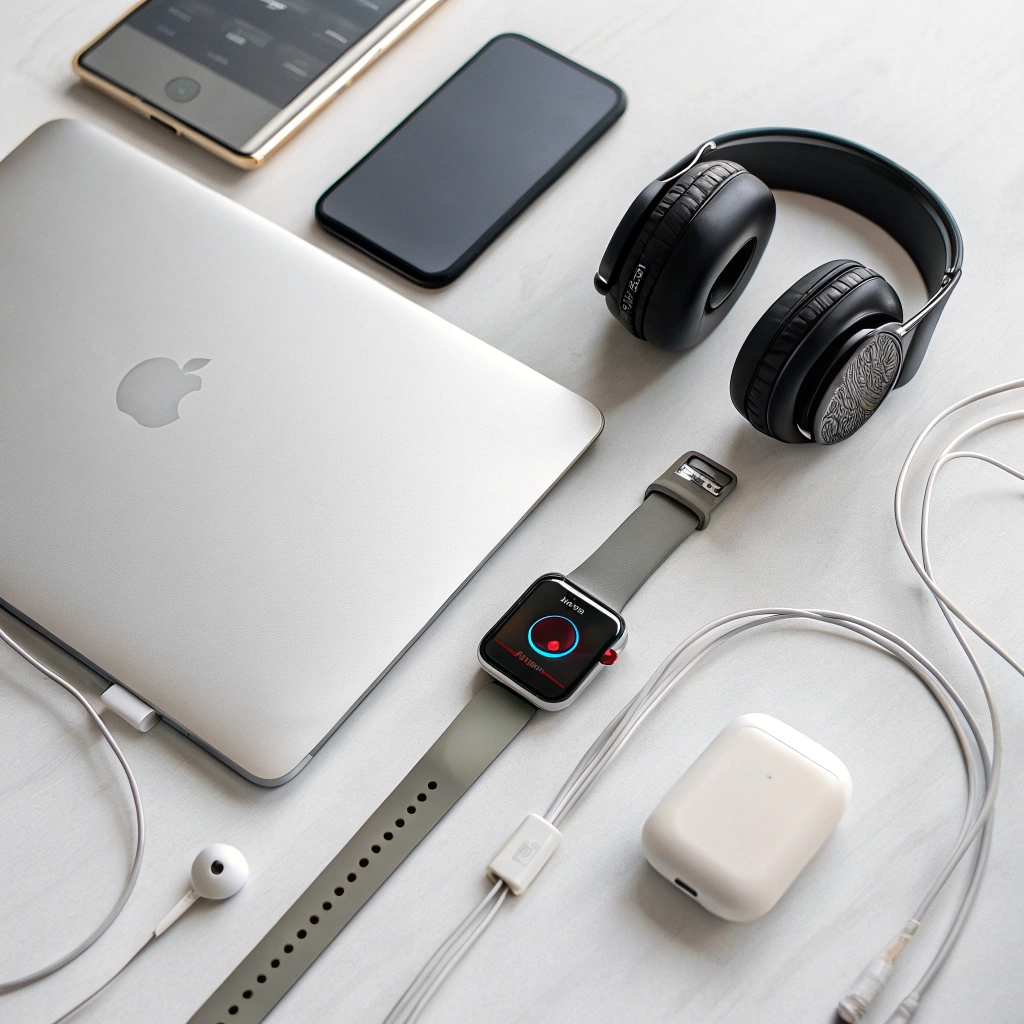 An array of tech gadgets arranged aesthetically on a minimalist desk