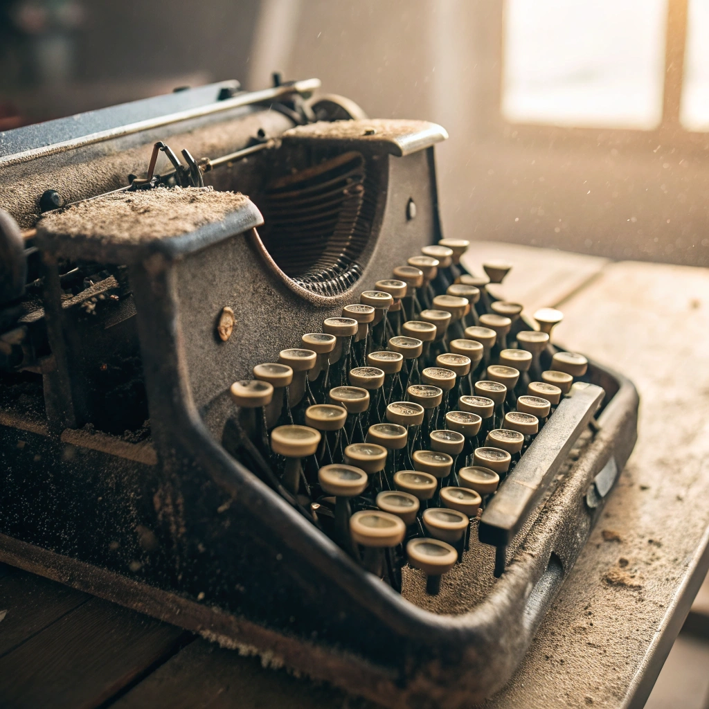 An artistic shot of an old typewriter covered in dust, reflecting the passage of time and nostalgia.
