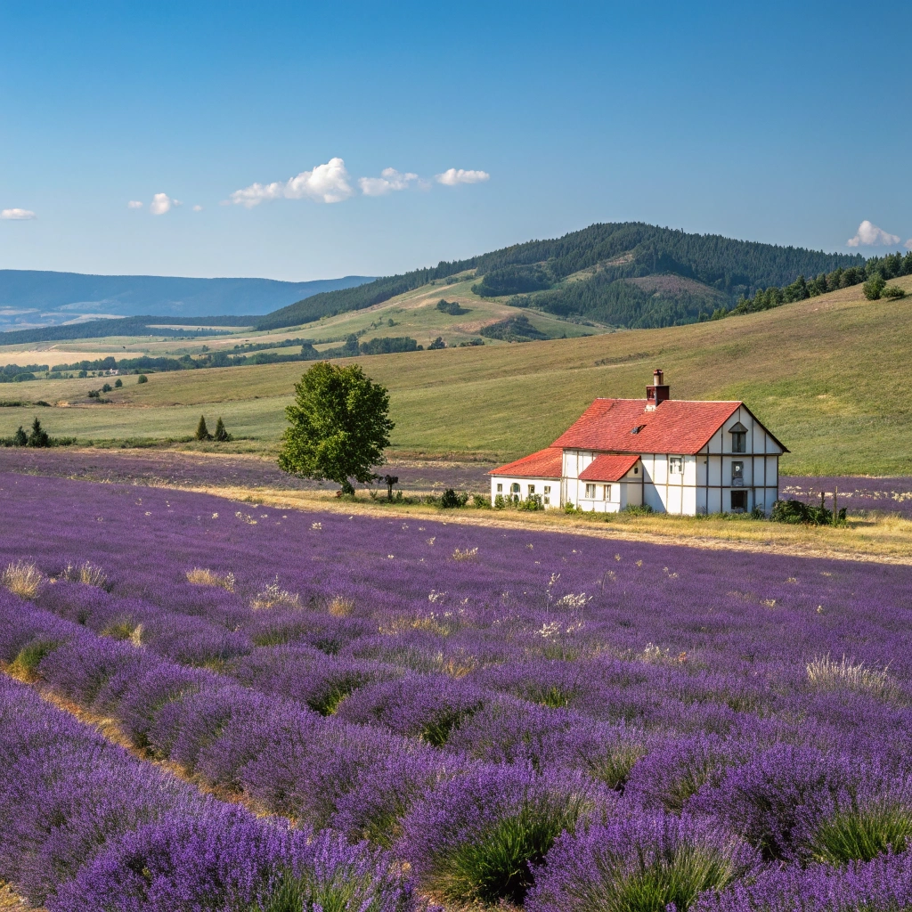 An expansive lavender field under a clear blue sky, with a rustic farmhouse in the distance.